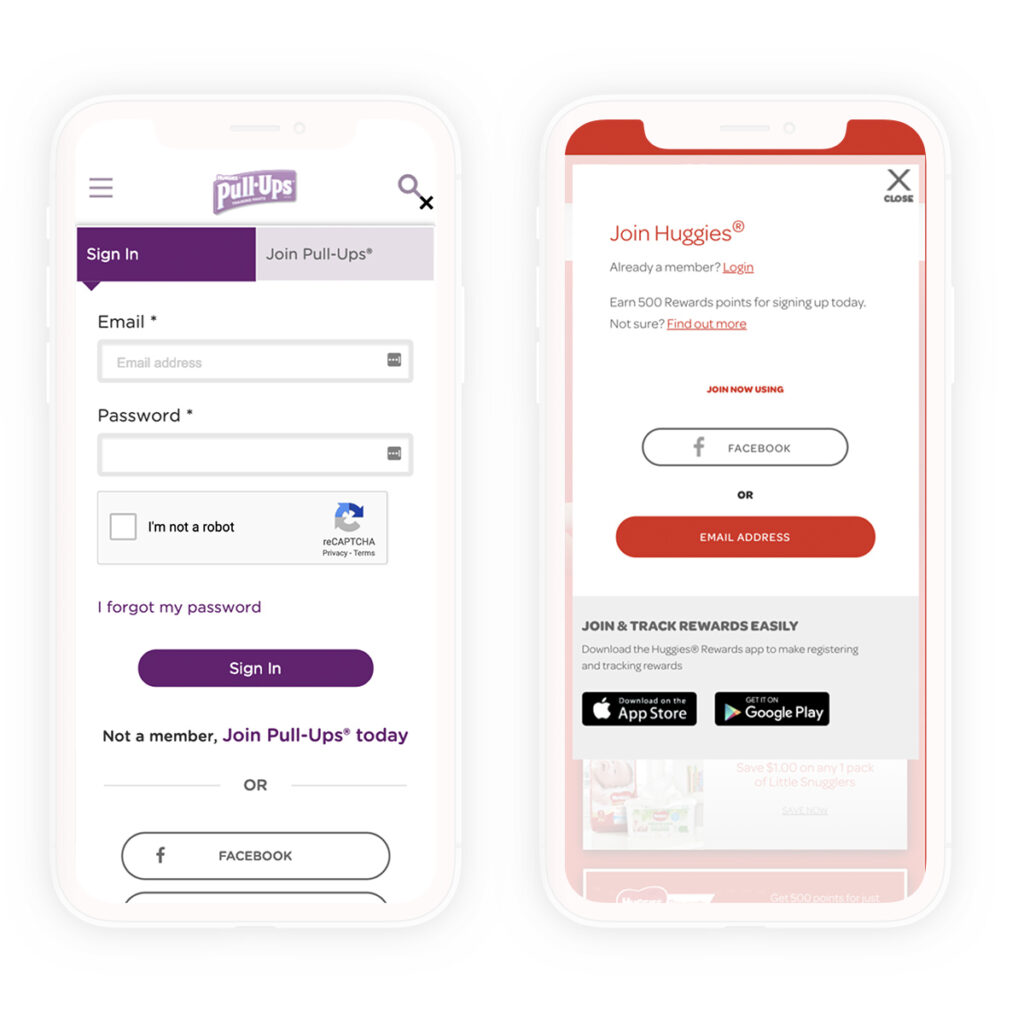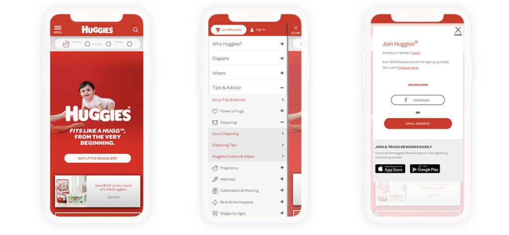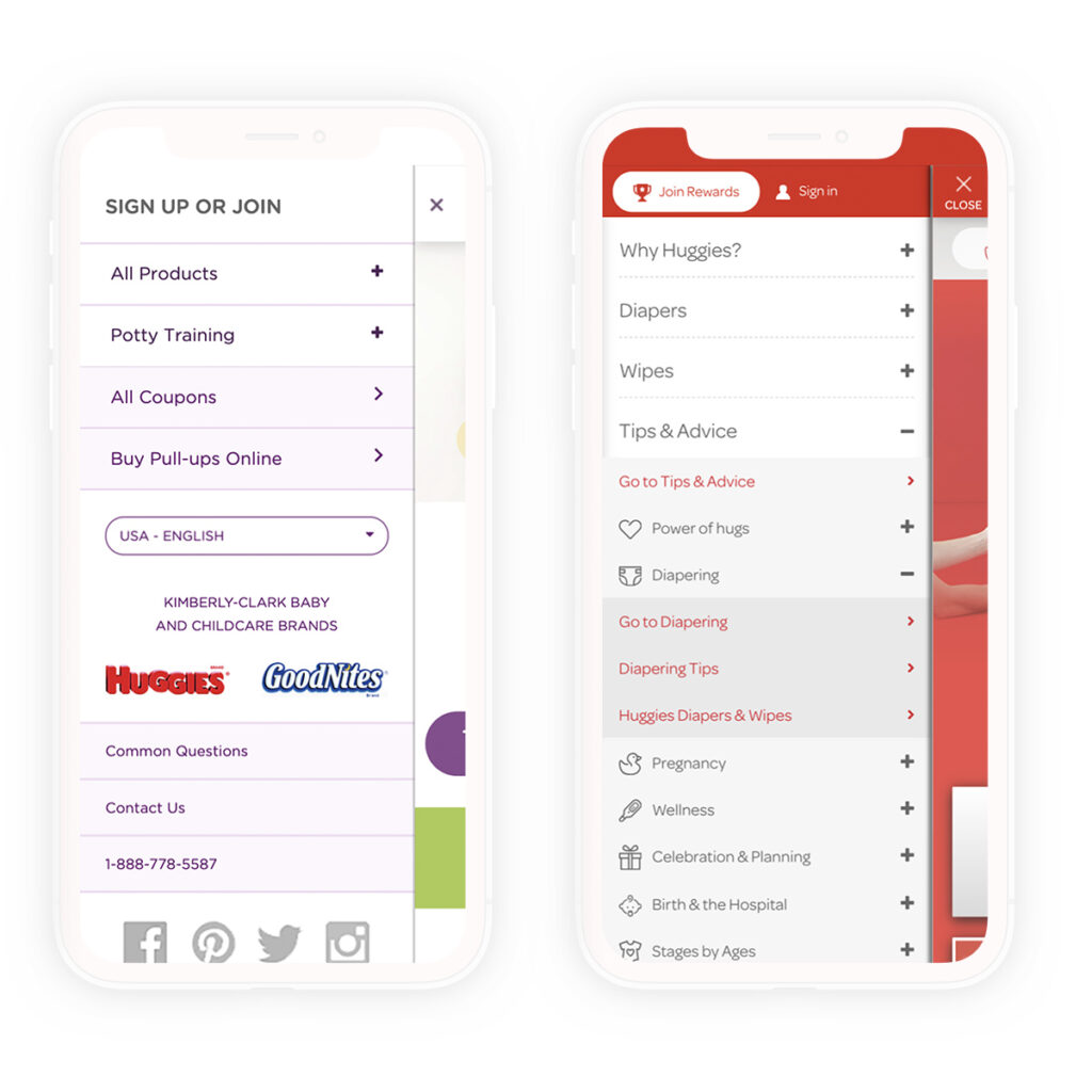 Huggies’ main website was nearly launched with updated branding when the team brought issues with the existing mobile navigation interactions and registration modal to the team.